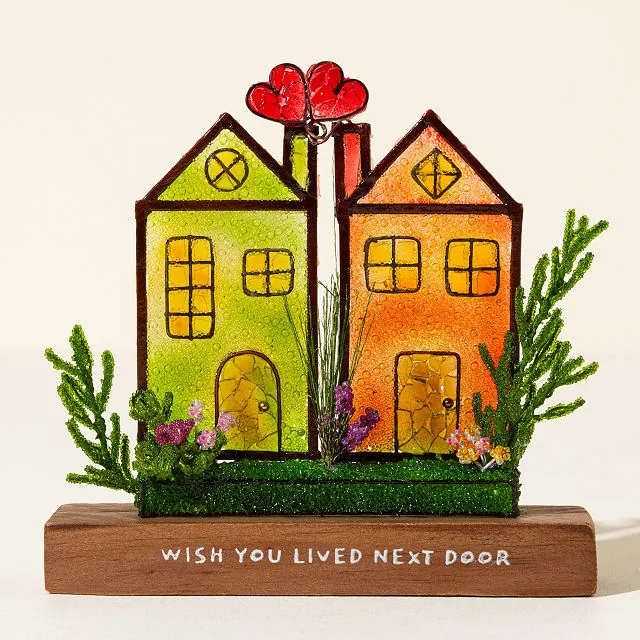 Keep the people you care about close at heart with the Wish You Lived Next Door Sculpture. This handcrafted piece transforms a heartfelt sentiment into art, featuring two stained-glass houses connected by twined red hearts. Perfect for friends, family, or loved ones far away, it serves as a beautiful reminder that love and friendship transcend distance.