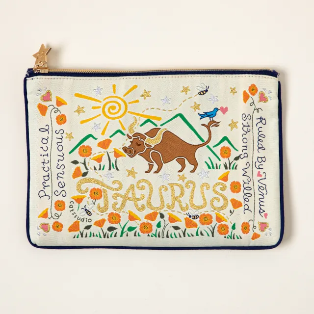 Each pouch is designed with a navy-blue constellation lining and a sleek gold star zipper pull, combining thoughtful details with a touch of luxury. The artwork is rendered in vibrantly colored and metallic thread, ensuring the designs shine as brightly as your astrological sign.
